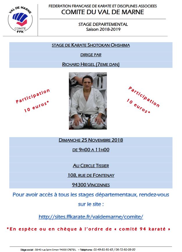 A noter dans vos agendas, le stage technique (ouvert à tous) dirigé par Richard Hiegel (expert fédéral Shotokan Ohshima) le dimanche 25 novembre au Cercle Tissier (Vincennes) de 9h à 11h00.